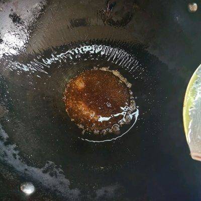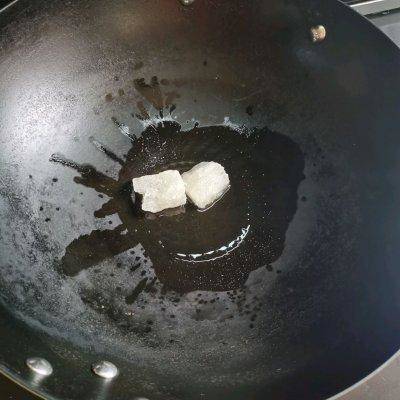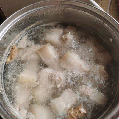 8、放入五花肉,老酒,老抽,生抽,八角,香叶