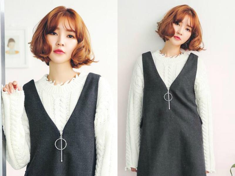 女生的一头短发经过卷发打理,变得卷翘而蓬松,翻卷的头发线条充斥在发丝里,贴垂在脸颊两侧使女生略微圆润的脸蛋变得细小很多,几缕刘海随意垂散在额前,衬出女生光洁饱满的额头,为女生增添可爱活泼的气息。