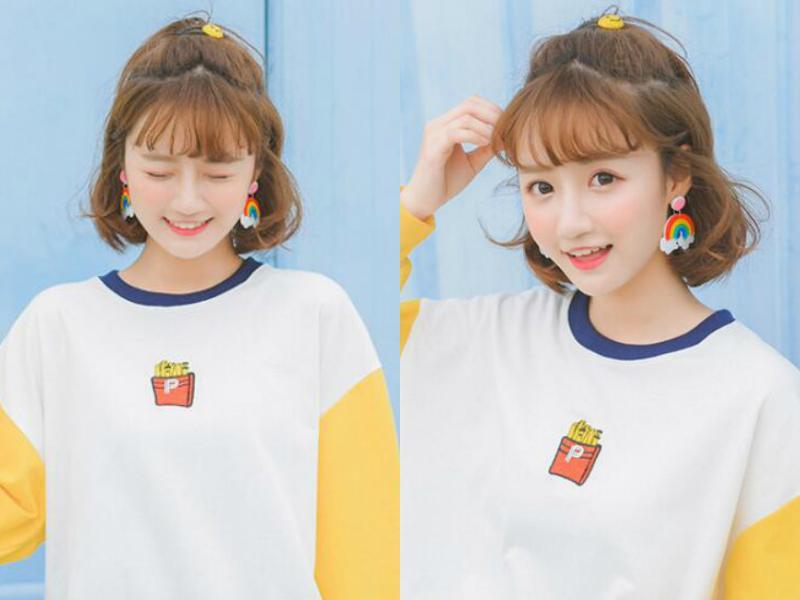 女生短发弄一个摩卡波波头真的很好看,灵动的烫卷发丝,搭配温柔内扣的空气刘海,很显女生的秀丽,扎起苹果头,戴上别致的彩虹耳饰,再加上温暖的发色,甜美可爱的少女感。