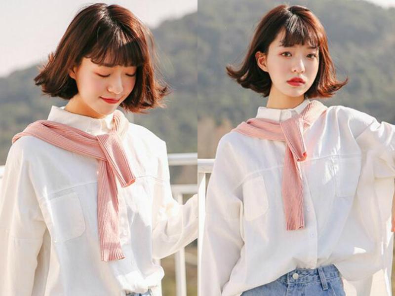 简单的直发波波头,齐脖子的长度,搭配上轻薄稀疏的刘海,很好的修饰出女生可爱的瓜子脸,把头发别到耳后,五官变得立体起来,没有染色的头发黑亮柔和,让女生变得清纯可爱。