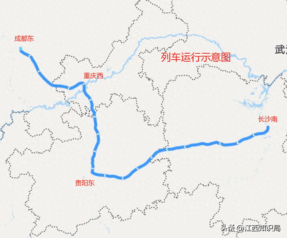 G2161次列车由长沙南至成都东,途经贵阳、重庆,耗时约8小时