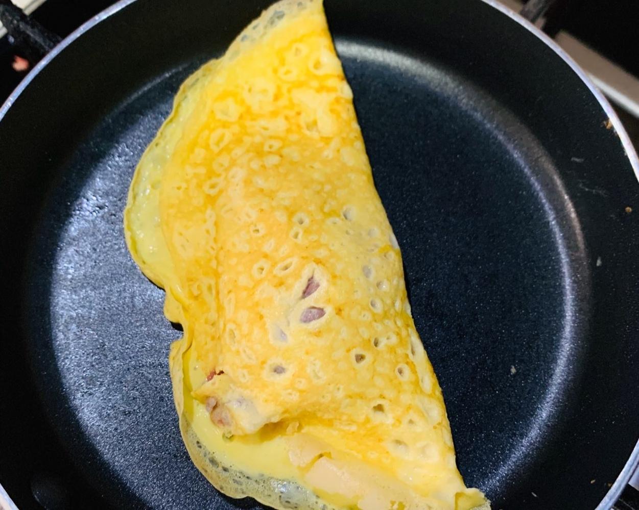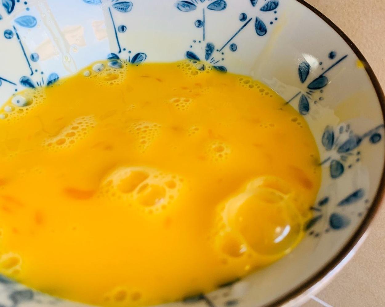 2、把另外半个鸡蛋打入碗中,搅打成蛋液备用。起锅,把一个圆形的锅放到火上,均匀地涂抹上少许的油。先用面粉和清水混合在一起,成浆糊。然后在浆糊中,打入3个鸡蛋。搅拌均匀后,将面粉鸡蛋糊舀入圆形锅中。