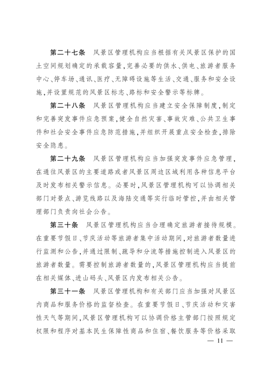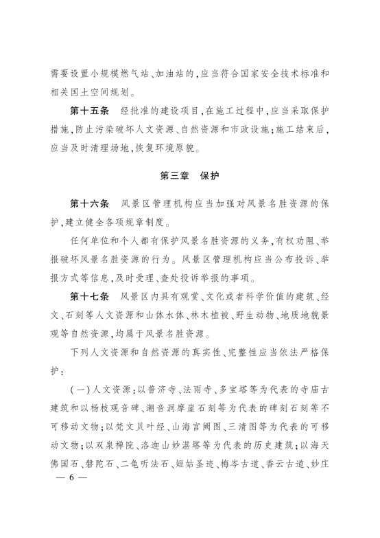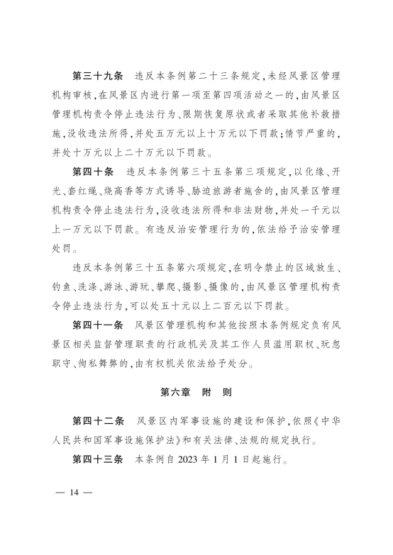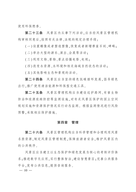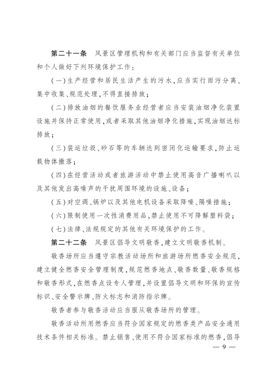 《条例》以景区可持续发展为目的,坚持将保护风景名胜资源和生态环境放在风景区工作首位,遵循“保护优先、利用服从保护”原则,细化风景名胜资源范围,根据资源不同特点设置分类保护措施,并将危害文物安全、刻划涂污景物、擅自释放外来物种等破坏风景名胜资源的行为列为禁止性活动。