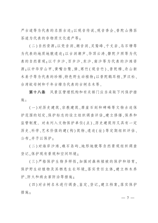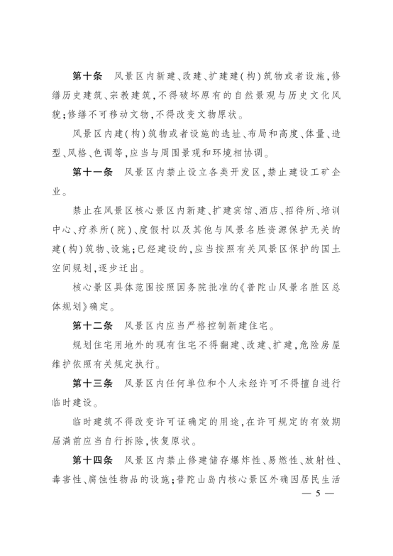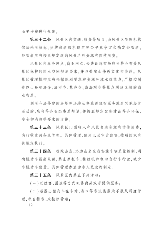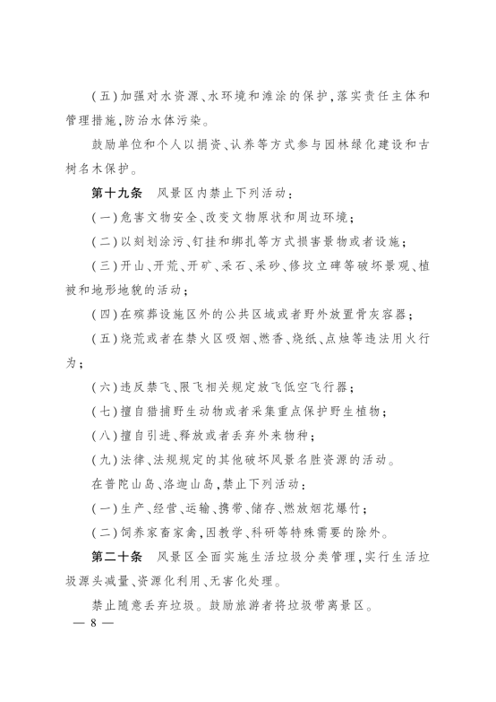 针对景区管理困境,《条例》从规范市场行为、保护景观等需求出发,明确禁止以化缘、开光、套红绳、烧高香等方式诱导、胁迫旅游者施舍或假冒僧尼变相乞讨等违反旅游管理秩序行为,并针对区域内明令禁止的放生、钓鱼、攀爬等行为制定相应约束和规范条款。同时,着眼风景区保护和交通安全,规定在普陀山岛、洛迦山岛实施车辆总量控制,禁止摩托车、拖拉机和电动自行车行驶。