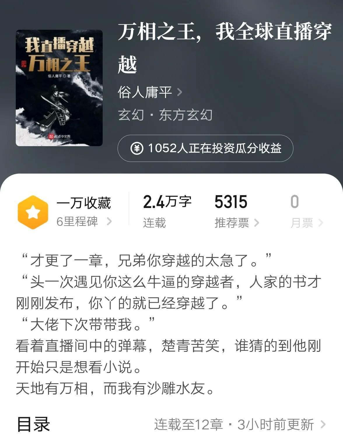 《万相之王,我全球直播穿越》这本小说,原著三天才不过2.2万字,可是这同人文3个小时就已经2.4万字了。小编甚至都不知道应该佩服同人作者揣摩土豆原著的能力太过于强悍,还是欣慰土豆原著的亲和力太过于霸道。