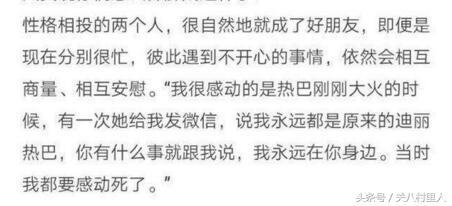 迪丽热巴和李溪芮性格相投,虽然如今两人都很忙碌,但关系还是非常的好,李溪芮则说“我很感动的是热巴刚刚大火的时候,有一次她给我发微信,说我永远都是原来的迪丽热巴,你有什么事就跟我说,我永远在你身边。当时我都要感动死了。”