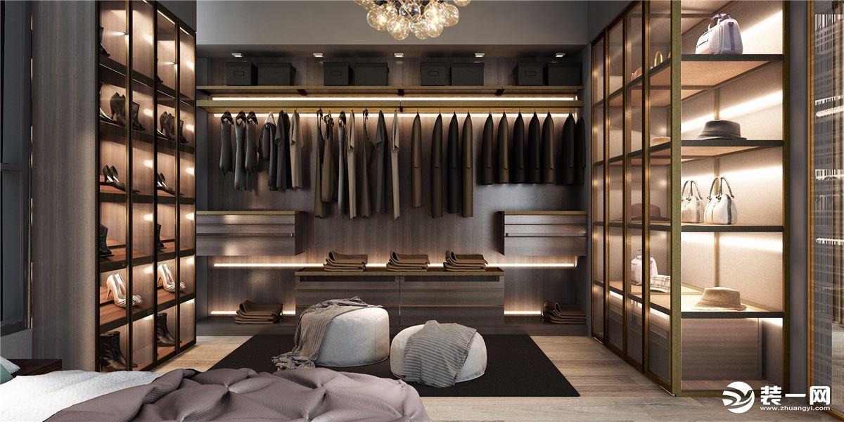 3.若是在卧室衣帽间一体化设计中要设计顶柜的话,最好是放一些面积大且重量小又防潮的物品,而比较重一点的可以放在底柜中,既安全拿放的时候也方便。