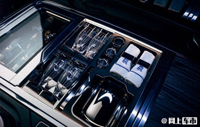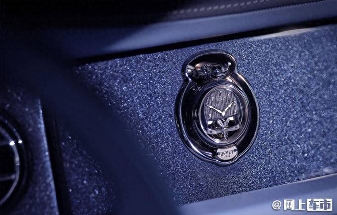 劳斯莱斯全新Boat Tail内饰也采用了大量蓝色真皮覆盖件,同时新车搭配了由BOVET定制的精美钟表,而该款钟表也可佩带在手腕上,或取下放置在中控台上方,作为车载时钟来使用。
