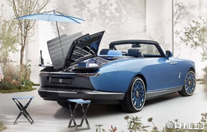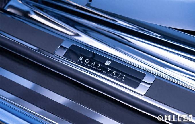 劳斯莱斯全新Boat Tail前脸装配了经典的家族式金属直瀑进气格栅,上方也依旧配备了经典的隐藏式立标LOGO。侧面提供了可折叠软顶敞篷设计,并配备了蓝黑相间配色的定制轮毂。车尾则选用了隐藏式排气布局,以及造型更为狭长的LED尾灯组。值得一提的是,车尾部分下方还隐藏式定制的“移动餐桌”,进一步提升了整车豪华气息。