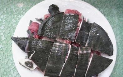 2、将甲鱼放入沸水中烫两分钟捞出,冲凉后刮干净甲鱼全身黑皮,不要把裙边刮掉了。