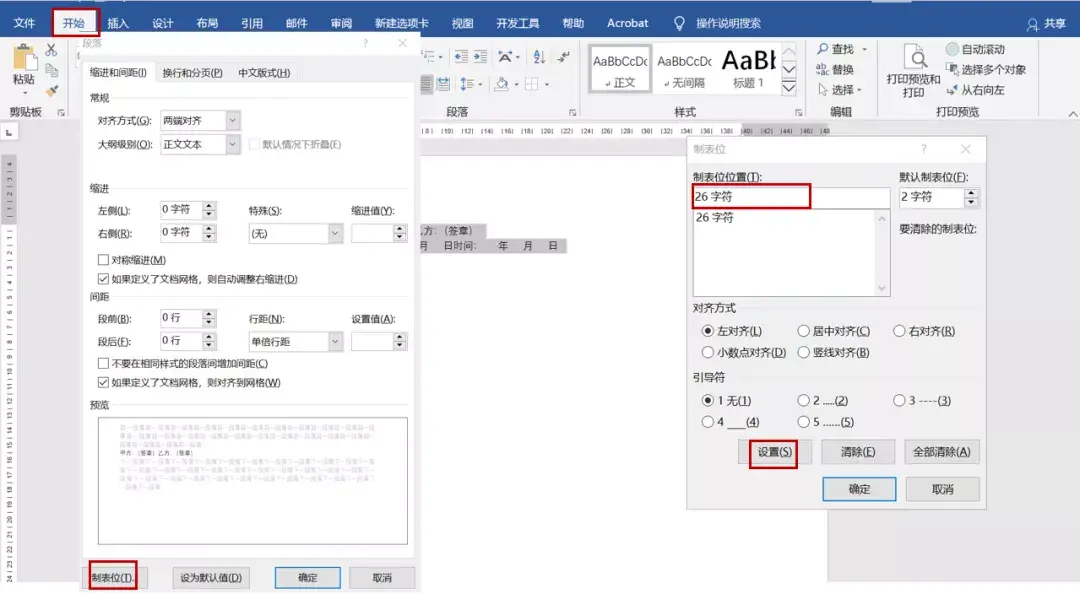 选中文本内容,之后点击开始——段落——制表位,在打开的制表位对话框中输入中输入字符,比如“26字符”,点击设置,确定之后利用Tab键即可快速对齐。