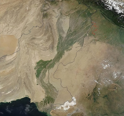 印度河是巴基斯坦主要河流,也是巴基斯坦重要的农业灌溉水源。其中下游的印度河流域灌区,则是世界上最大的完整连片的灌区,灌溉总面积达1400万公顷。灌区以种植小麦、水稻、棉花等作物为主,是巴基斯坦赖以生存的的“粮仓”。