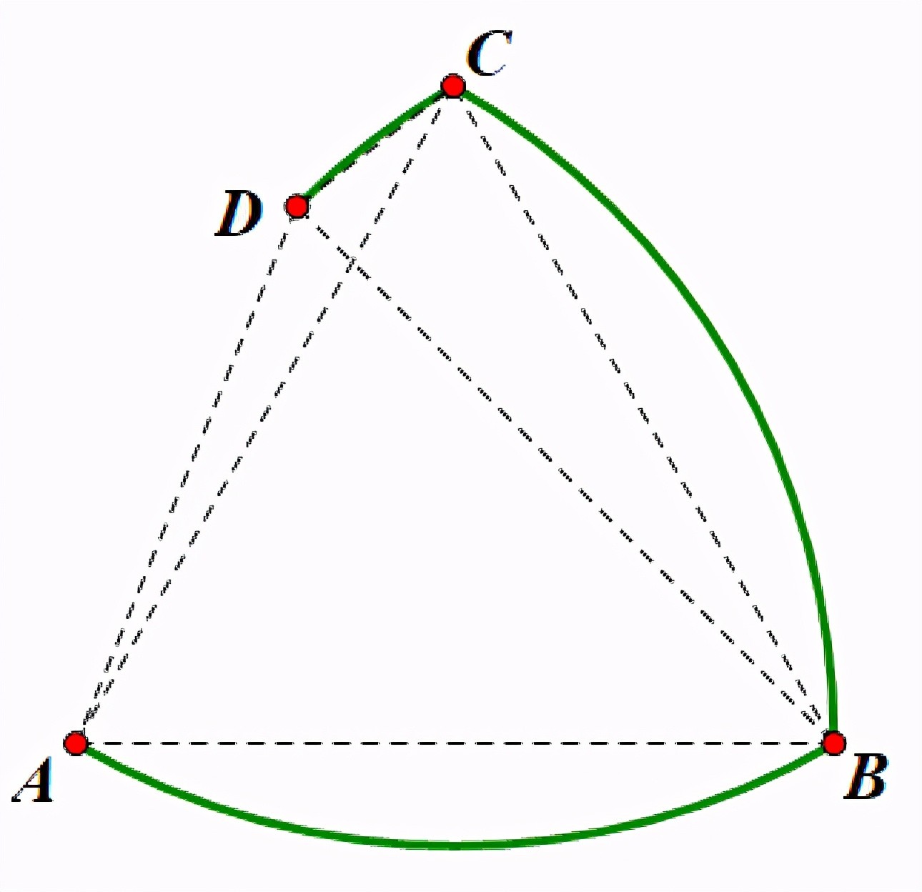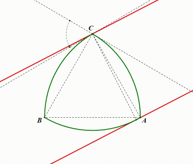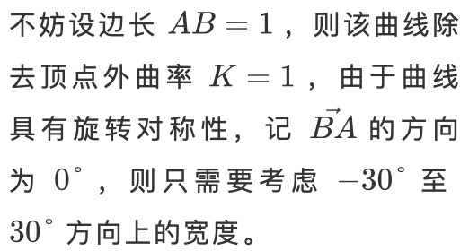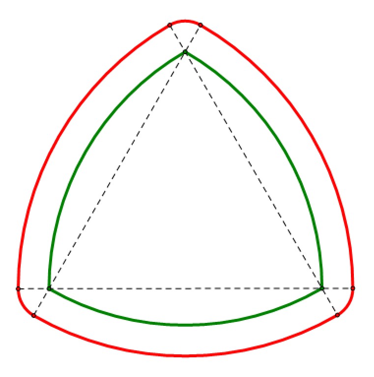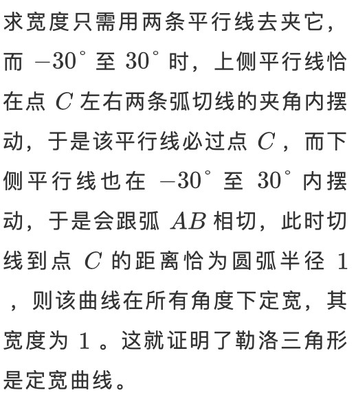 其次,勒洛多边形的所有曲线都是圆弧,由定宽性,这些圆弧的曲率都必须相同。