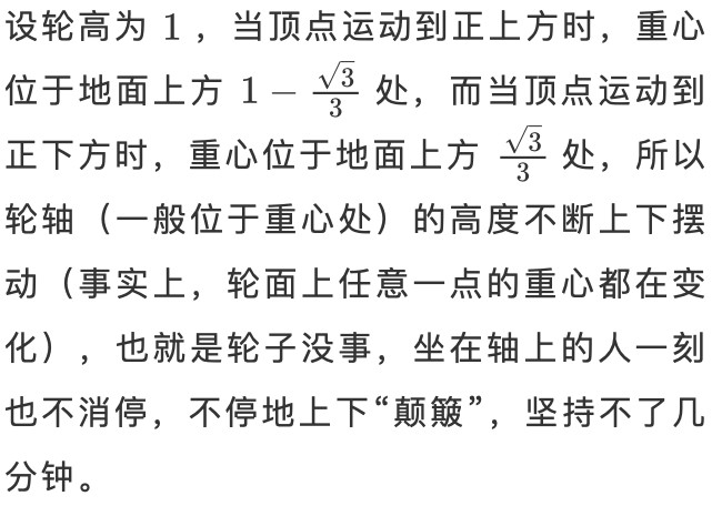 但是如果要在轮子上装轴,勒洛多边形就不能胜任了。比如自行车、汽车、旱冰鞋。如果用了勒洛多边形,就会上下颠簸,无法使用。