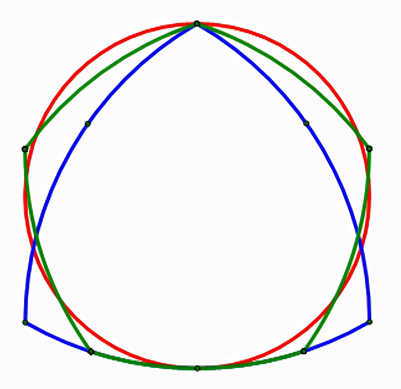 (该图形在圆弧的六处连接处仍存在尖点,这些点曲率均不存在,但此时尖点左右两处领域的切线夹角要小很多,因此光滑得多了)