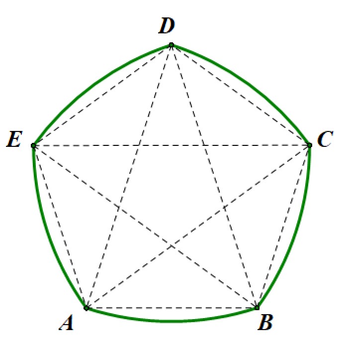 为了保持曲线的曲率一定,又注意到在画弧时半径都是对角线长,所以五边形的五条对角线(这里只需要求顶点距离最远的一组对角线,但五边形的五条对角线均在该组)必须相等,而边长则没有要求。