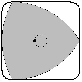虽然不能用来做轮子,但由于勒洛多边形是定宽曲线,所以可以在正方形内部贴着旋转,又由于重心不断变化,所以可以覆盖更多面积,这样旋转一周,覆盖面积接近正方形的面积。