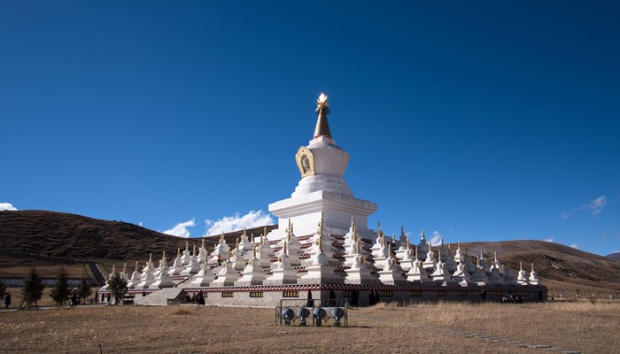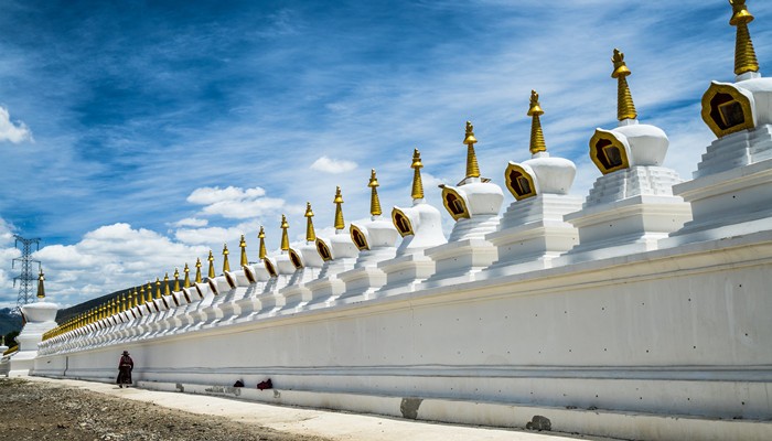 藏传佛教寺院中的白塔是藏经塔,也叫经塔。藏式白塔是藏人建筑艺术中最具特色、富有内涵的一种建筑艺术,许多塔具有重大纪念意义和象征意义,白塔在藏区随处可见,一般与寺院并存,不少村庄附近也有白塔,一些名山名湖周边也可见到,是雪域高原的一道靓丽的风景。