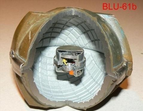 焦桃弹内部,中间为引信,具体型号为BLU-61 B