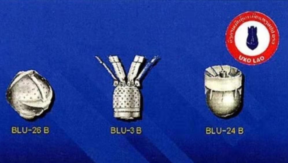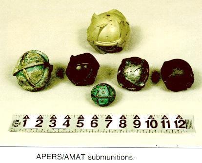 集束炸弹人员杀伤子弹药种类很多,最常见的是中间的“菠萝弹”与左侧的“焦桃弹”