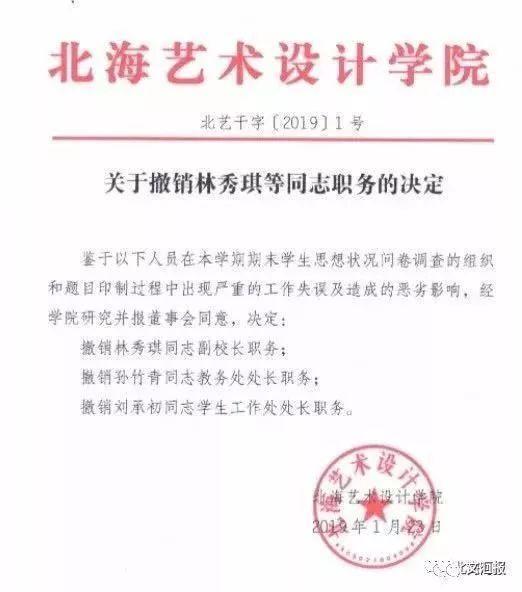 1月23日,广西壮族自治区教育厅发布通报,针对备受关注的广西北海艺术设计学院“大尺度试题”事件,广西教育厅已责成该校作出书面深刻检查,对存在问题立即整改,对该校在此事件中涉嫌违纪的党员,有关纪检监察机关已启动问责程序。该校执行董事郑某引咎辞职,撤销了一名副校长和教务处处长、学工处处长的职务。