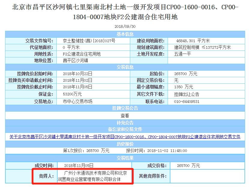 最终,小米旗下广州小米通讯技术有限公司和华润置地全资子公司北京润置商业运营管理有限公司联合体以26.57亿元的起始价竞得该地块。
