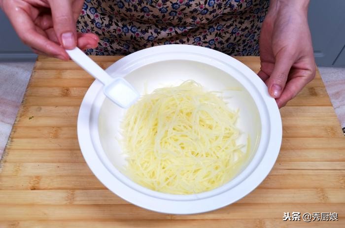 5.将土豆丝装入盆中,加入适量的盐,胡椒粉,打入2个蛋清,搅拌均匀。