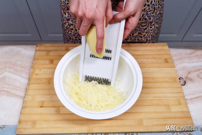 2.将去皮的土豆,用擦丝器擦成细丝,装入盆中。