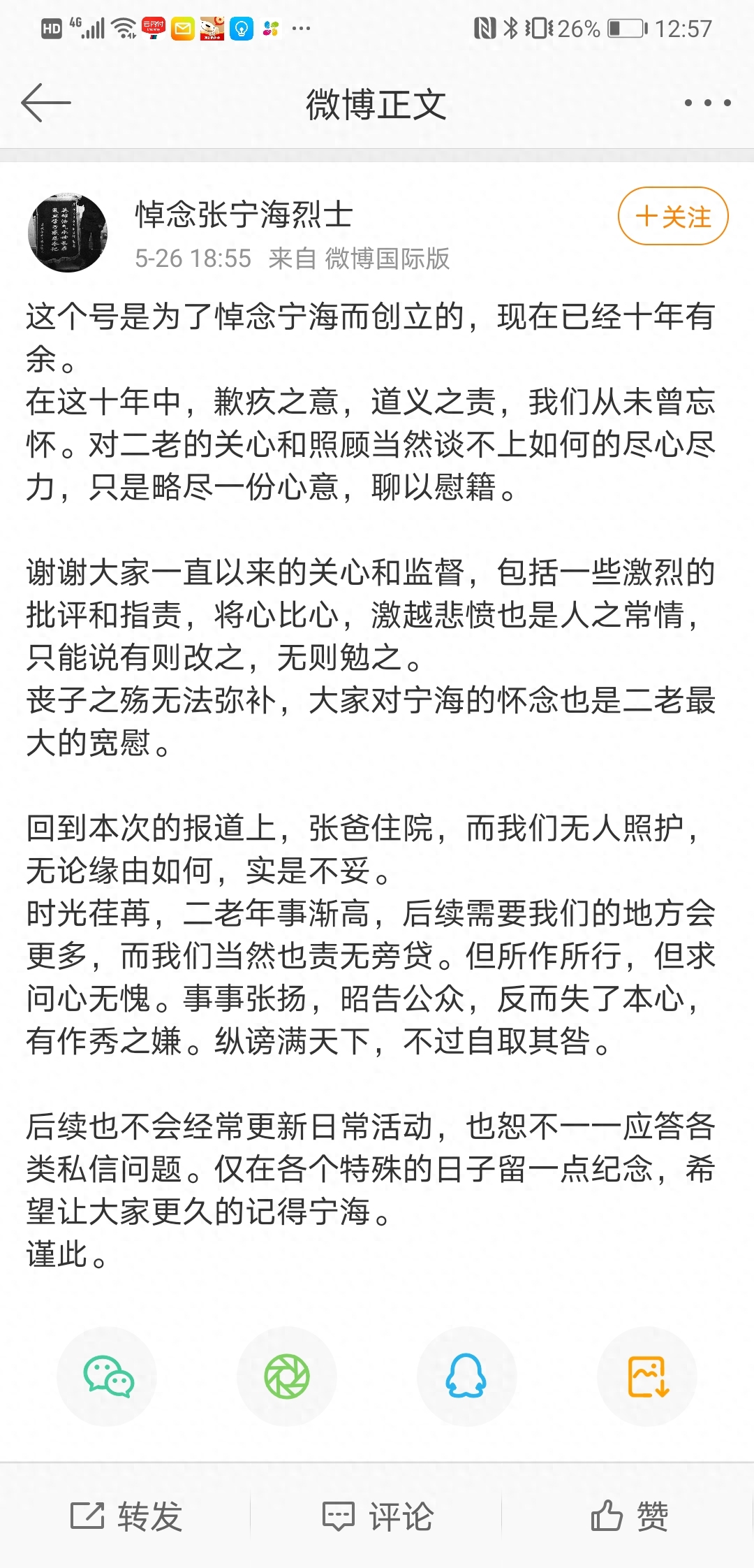 这个微博的账号名为@悼念张宁海,运营者正是当年探险队的其中一名成员,来自复旦大学。他说自己这十年中,始终没有忘记歉疚之意,道义之责,对两位老人的照顾当然谈不上尽心尽力,只是略尽一份心意,聊以慰籍。不管这件事的缘由如何,确实是他们没有做好。他们所做之事,但求问心无愧,不会事事张扬,否则有作秀之嫌。纵谤满天下,不过自取其咎。