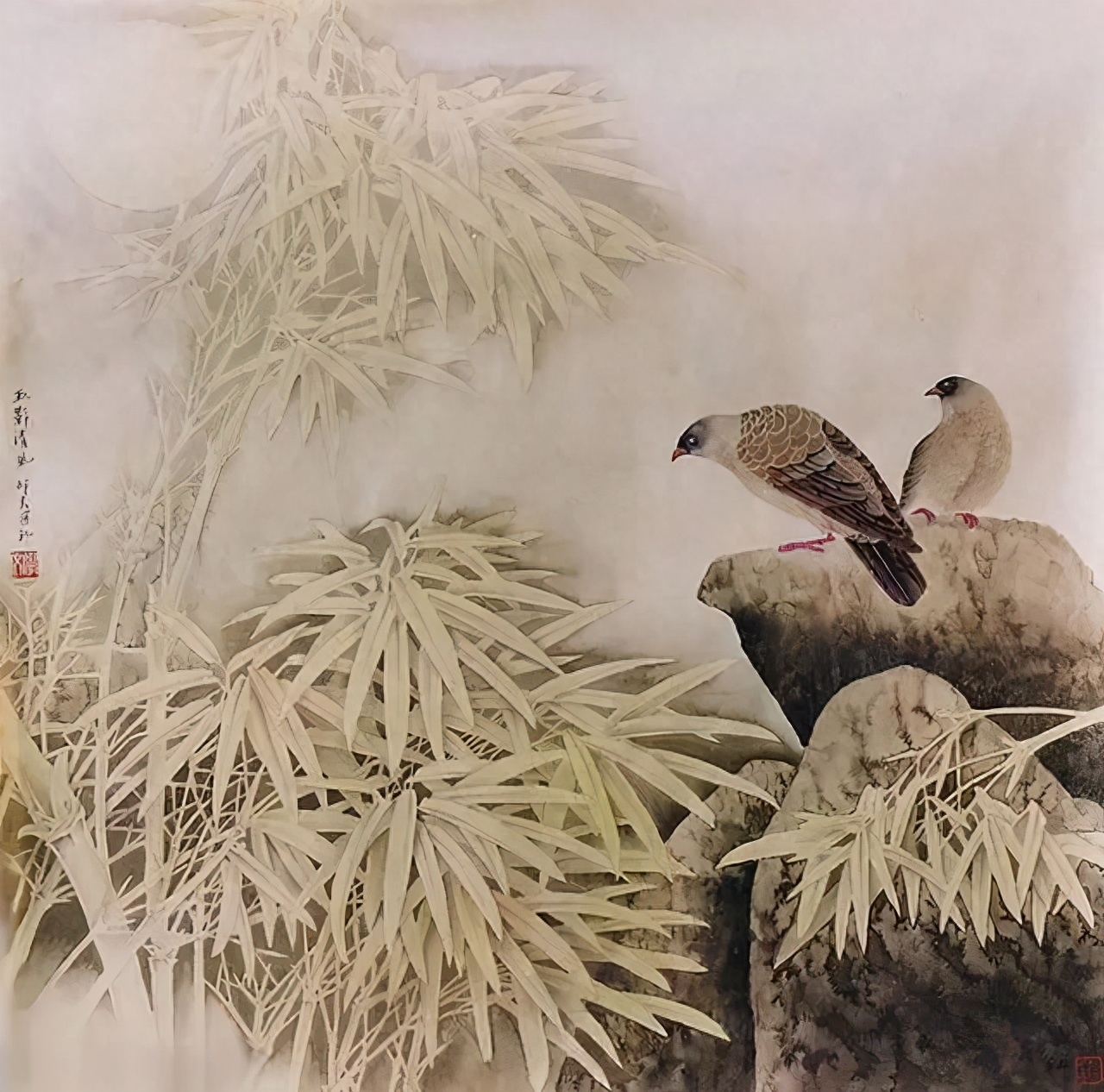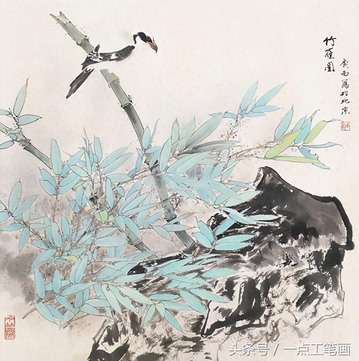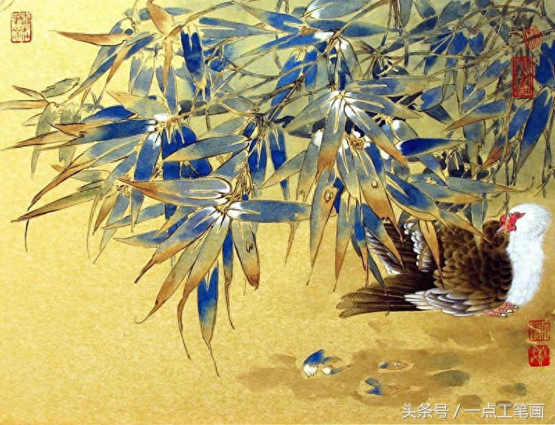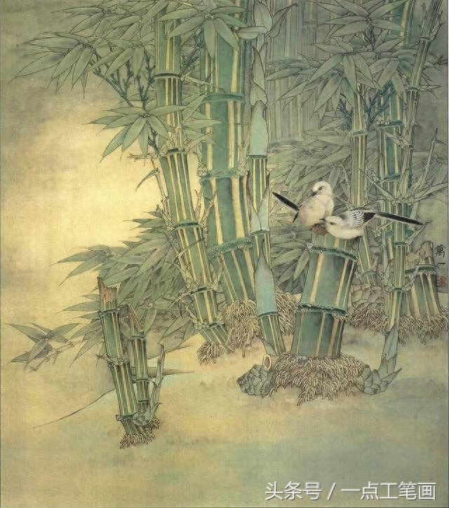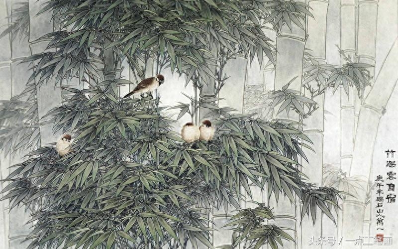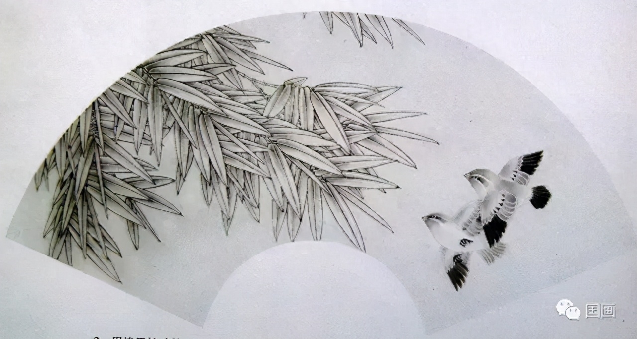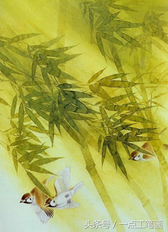 用中墨勾竹叶,线条要挺拔。 鸟用淡墨勾出,鸟嘴. 眼. 爪用重墨勾出。