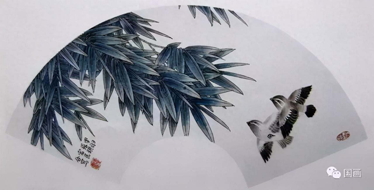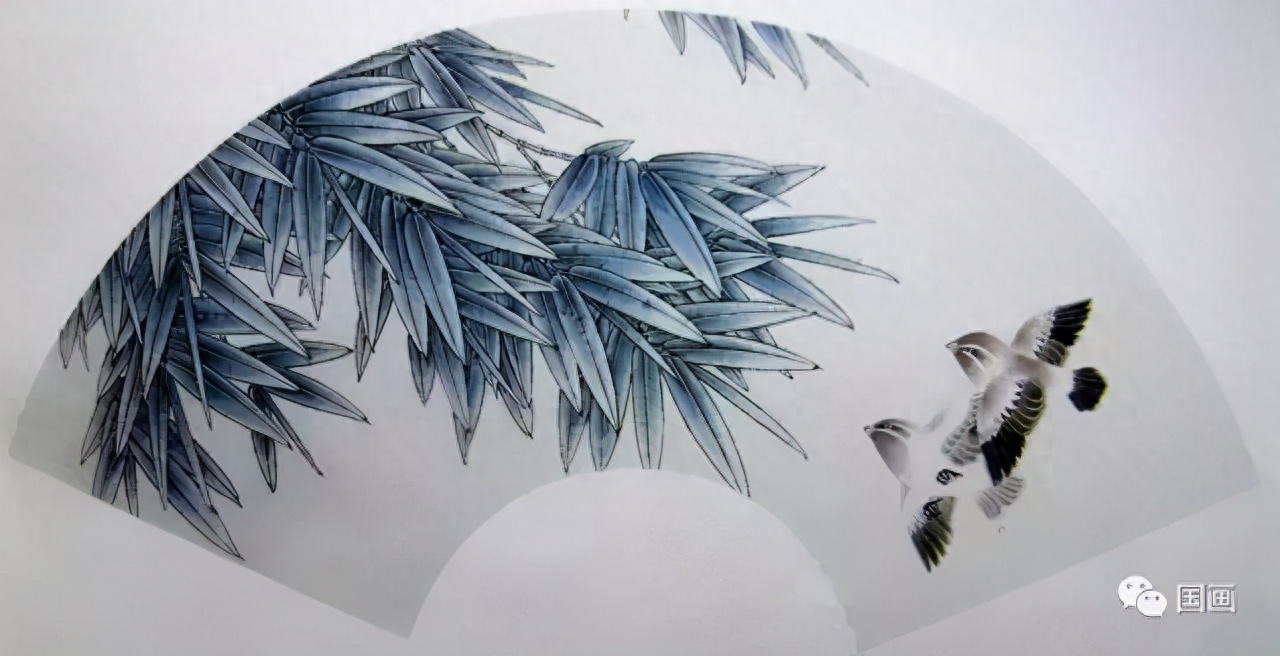 竹叶为互生,中叶细侧叶宽, 每个叶片均由左右两笔弧线组成, 用笔勾线要挺拔。 几组叶子之间穿插组合要注意疏密。
