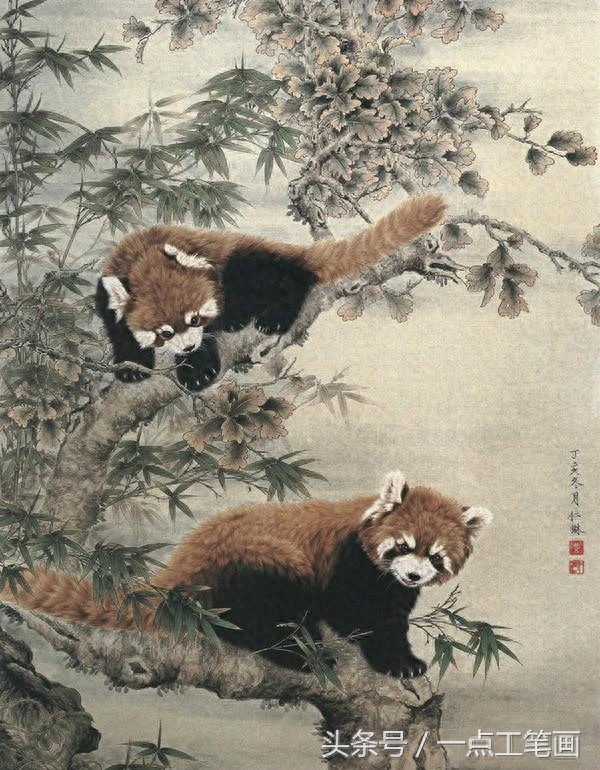 鸟头和背在淡墨基础上再分染赭石, 胸腹用胭脂分染。