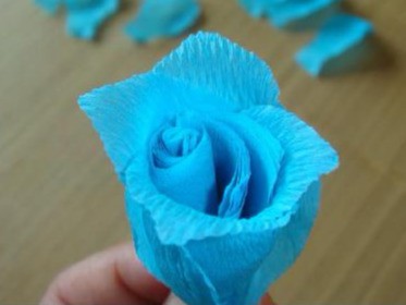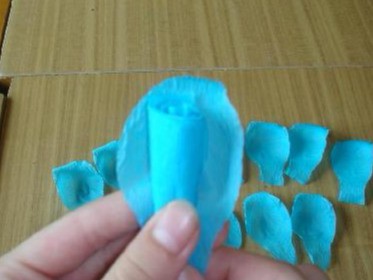 4、然后将花瓣一片一片分开,把刚刚剪花瓣剩下的纸卷好,做成花心。