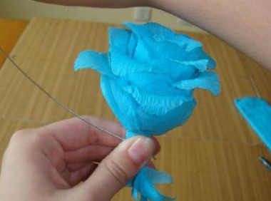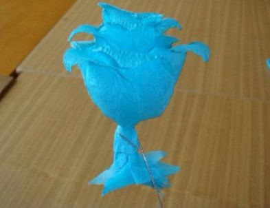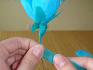 6、全部花瓣包完后,用一根细铁丝将根部绑紧。将根部多余的地方剪掉,在剪三个绿色的花托,粘在花朵的根部。