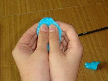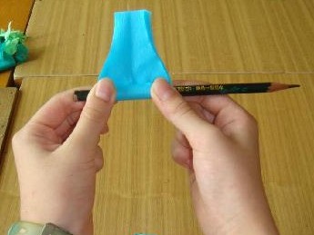 完成:右手抻着纸条,左手捏住铁丝慢慢捻,将纸条卷在铁丝上。
