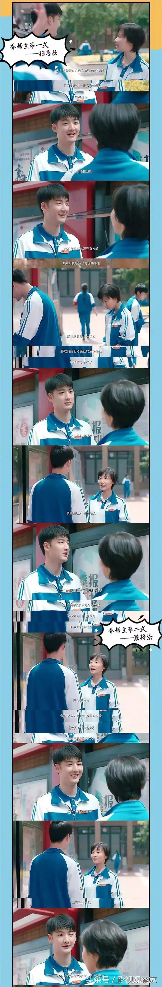 为了动漫社顺利在振华中学成立,李牵饰演的米乔简直无所不用其极,先是低眉顺眼的对学生会主席拍马屁,这招行不通,机灵的米乔一个眼神立马改换激将法,“恩威并施”后再软磨硬泡,尽管是简单的几句台词,李牵却把米乔作为“乔帮主”绞尽脑汁为动漫社谋利益的认真和古灵精怪的形象诠释得惟妙惟肖。