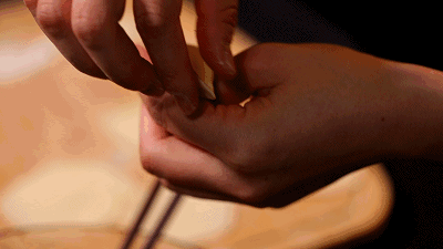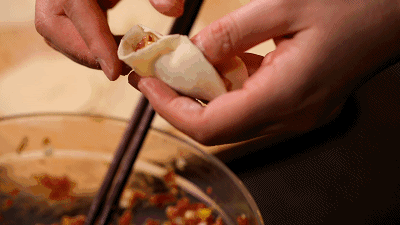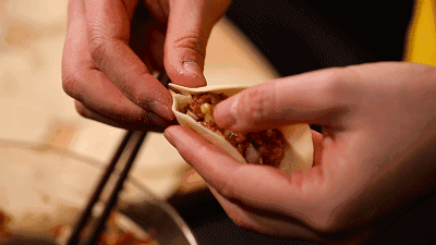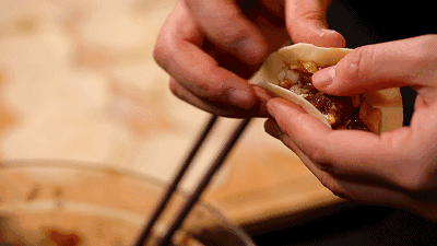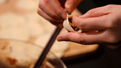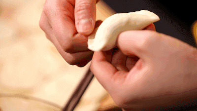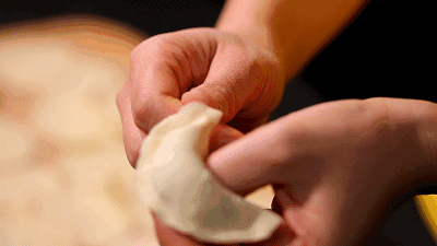 取饺皮一张于掌心,放入适量馅,饺皮对折封口成半圆形,将其边缘捏紧。自左向右用右手拇指和无名指碾饺子边缘。