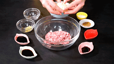 将葱、姜、鸡蛋、生抽、料酒、蚝油、老抽、盐、饺子料放入肉馅中,搅拌上劲。