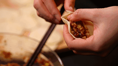 取两张饺子皮,其中一张放入适量馅,另一张盖住饺子皮,将其一圈捏紧,随后像锁边饺子包法一样捏出花边。
