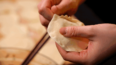 取饺皮一张于掌心,放入适量馅,饺皮对折封口成半圆形,将其边缘捏紧,分别用左手和右手拿着饺子的两端边缘捏在一块。