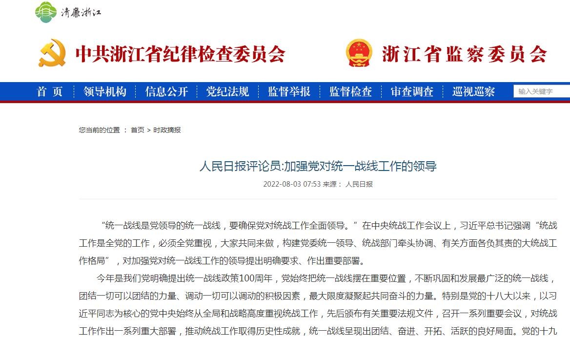 中共浙江省纪律检查委员会、浙江省监察委员会,人民日报评论员:加强党对统一战线工作的领导
