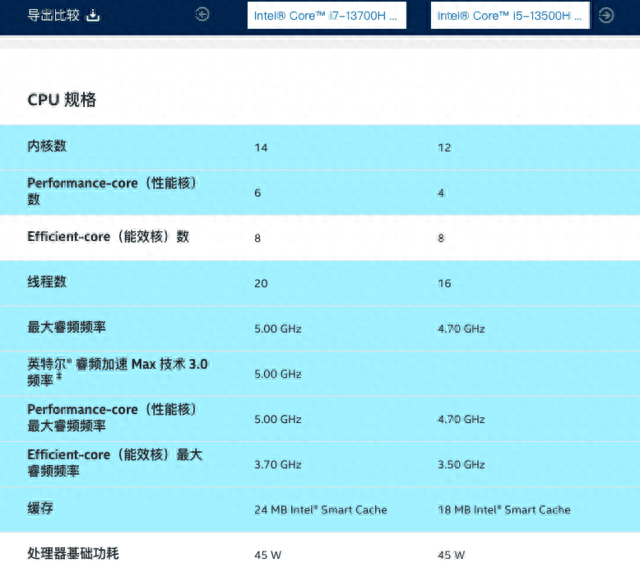 可以看到,在规格方面二者工艺相同,都是10nm制程,i5-13500H是12个核心16个线程,i7-13700H则拥有14核心20线程,这主要是因为13700H比13500H多了2个P核。三级缓存方面13700H也比13500H更大,为24MB。最大睿频方面,13700H比13500H高了0.3GHz,然后是核显,多了16EU。