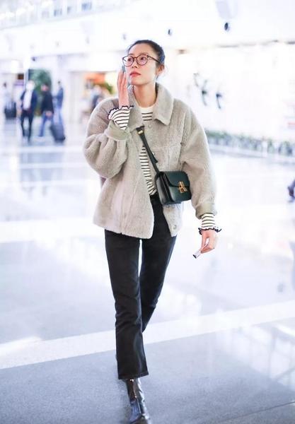 1、大表姐刘雯的乳白色羊羔毛外套,以黑白条纹为主的内搭,在搭配烟管裤和同色靴子也是十分帅气了。