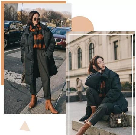 3、冬天离不开羽绒服啦,中长款羽绒服长度一般在膝盖上下,正好能遮住大腿露出最细的小腿部分,非常适合小个子或者腿比较粗的妹子了,搭配烟管裤和短靴就会有职场风的利落干练