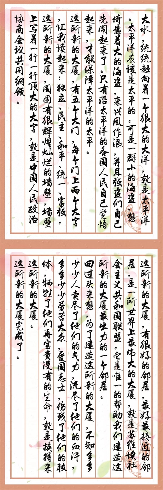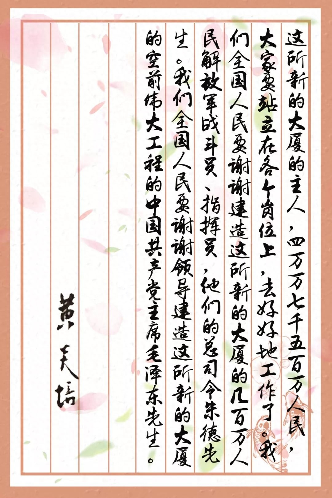 他把新生的中华人民共和国比作是一所新的大厦,“这所新的大厦,有五个大门,每个门上两个大字,让我们读起来:独立、民主、和平、统一、富强。”