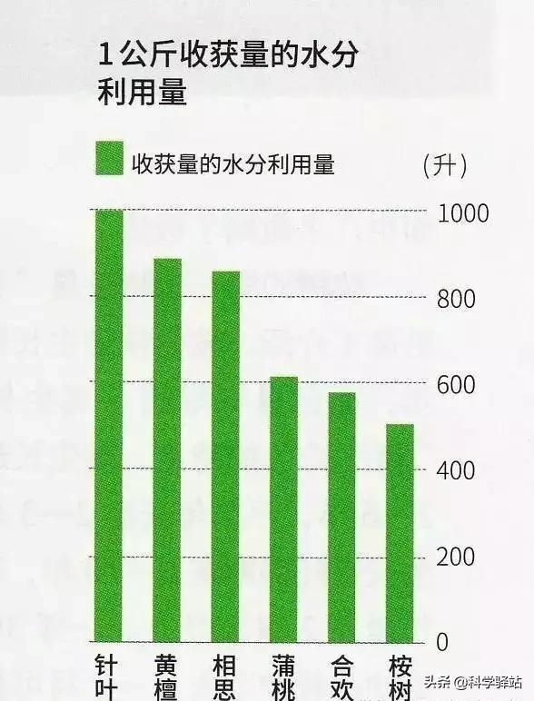 每合成1公斤生物量(干重),松树需要消耗1000升水,相思、黄檀、香蕉、咖啡等树种消耗800升以上,而桉树只需要510升,是这些植物里面耗水最少的。