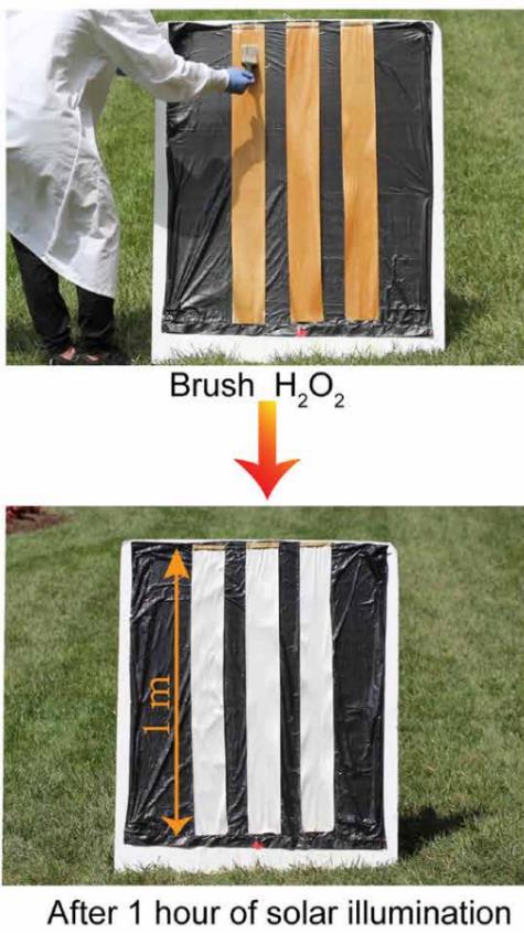图源:文献[2]这个方法的发明者是来自马里兰大学材料科学与工程学院胡良兵教授团队的夏芹芹和陈朝吉,在把一块1m长、1mm厚的巴沙木板做成透明木板的具体操作中,他们先在木板表面刷一遍双氧水,然后将其暴露在紫外线灯光(或阳光)下一小时,这时双氧水会漂白掉木质素的发色基团,只保留木质素的芳香族骨架。