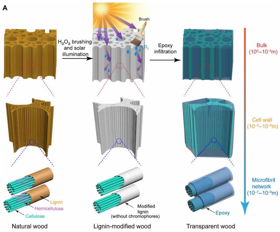 事实上,将木材变透明的关键就在于将木质素中的发色基团去除,保留其芳香族骨架。具体的操作流程简单来说就是:给木头刷双氧水,再晒个太阳,然后泡在酒精里,最后将一种透明材料环氧树脂填充进去,待其固化后就完成了。