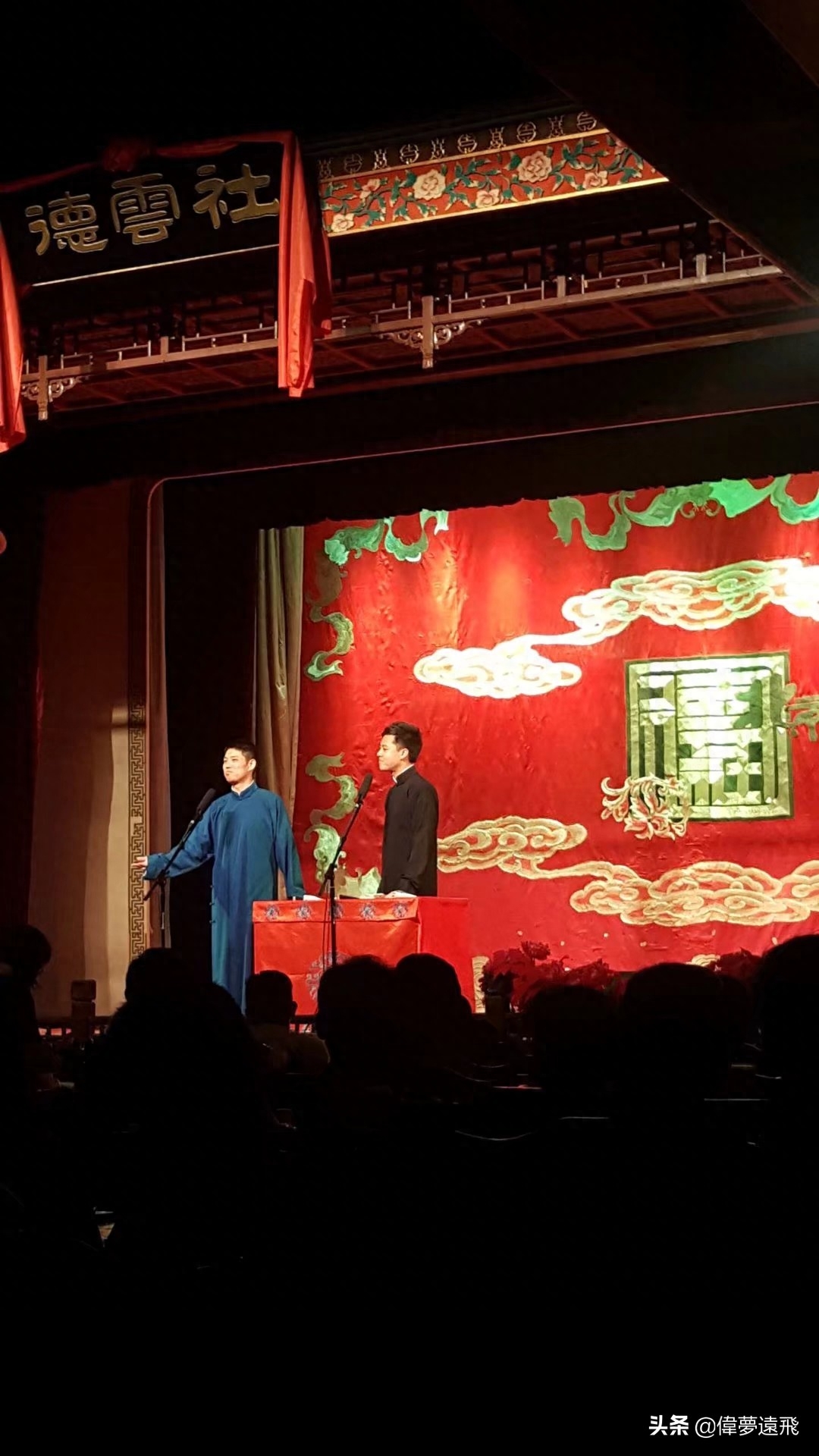 2018年七月,北京我来了!德云社我来了!在北京,我们先去了德云社的总部--天桥德云社,在天桥演艺广场远望德云社,大大的“德云社”三个字映入眼帘,和许多商铺没有什么区别,二层楼,很普通,正门在胡同里,朱褐色的雕花漆门,门上是大理石雕刻的花样,古色古香,下面是黑底金字的德云社牌匾。门两侧是一副对联:上联是:学笑艺为衣食雅谐共赏;下联是:奉高朋孝父母亲和天下。门口有很多人,后来感觉那可能就是传说中的黄牛。曾听郭德纲在一个采访中说过:有段时间,德云社小剧场一票难求,门口很多人,那些黄牛自觉维护起了秩序,可见观众是有多么喜欢德云社,喜欢老郭。我们很顺利地用三张《祖宗十九代》票根换了三张小剧场的免费门票,第36桌,40元,当年很平民,也能接受,虽然位置在两侧,但能够亲自到小剧场看看,也知足了。入门迎面墙上木刻着老郭自己创作的《大实话》:“说天亲,天可不算亲,天有日月和星辰。日月穿梭催人老,带走世上多少的人。 说地亲,地也不算亲,地长万物似黄金。争名夺利有多少载,看罢旧坟看新坟。要说亲,观众们亲,观众演员心连着心。曾记得早年间有那么句古话,没有君子不养艺人。昨日里趟风冒雪来到塞北,今日里下江南桃杏争春。 我劝诸位,酒色财气君莫占,吃喝嫖赌也莫沾身,没事儿就把那相声大会进,听两段相声就散散心。 抱拳拱手尊列位,愿各位——招财进宝,日进斗金。”这段经常在视频上看到,演出结尾或返场时,老郭带领德云社演出全体为他的衣食父母(观众)唱出来的。小剧场大概有三百人座位的样子,一张八仙桌四周围六把木椅子,舞台上方拉着鲜红色带有祥云的帷幕,绣着金色“北京德云社”的字样,二楼还有一层,位置很好,想来票价也是比一楼贵的。观众很多,小剧场上座率目测达到了九成,不让带水和饮料,德云社前台经营茶水饮料苞米花等零食,今天一共有六对相声演员演出,后来才知道,是德云四队的演员,有许多是在网络上经常见的人:李云天、赵云侠、张鹤雯、冯照洋、史爱东、庄子健等,在演员表演之前,有许多粉丝们给自己喜欢的角献上了小礼物。这些相声演员,说学逗唱,各有千秋,虽然于谦徒弟冯照洋压轴,但是感觉还是李云天与史爱东搭档最好,李云天的快板绕口令那叫一绝,加之老将史爱东捧哏到位,赢得了不少满堂的叫好声与掌声,六对演员陆续出场,身边充满了笑声和叫好声,什么雅啊俗啊,只有快乐才能让人感到时间过得很快,最后冯照洋与搭档也返场犒劳观众。散场的时候,我仔细观察了那些观众,基本上都是年青人,有的还背着大大旅行包,看来,郭德纲能把年青人拉进小剧场听相声,真是难得,而且,德云社似乎也成了北京了一个旅游景点,那些背包的年轻观众可能就和我们一样,来北京旅游,顺便到德云社走一走看一看听一听。