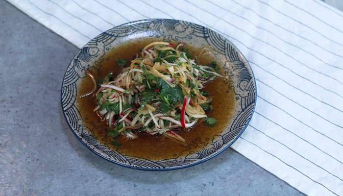 4、加入茶干、盐、糖、醋、橄榄油、芝麻油搅拌均匀,放置十分钟左右。